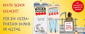 »Deutscher Humor ist, wenn man trotzdem nicht lacht«, behauptete der Schriftsteller Sigismund von Radecki. Stimmt nicht, behaupten wir, und treten mit den umwerfend lustigen und manchmal ein bisschen bösen Cartoons in »Eulenspiegels Postkartenkalender 2026« und »Eulenspiegels Böser Kalender 2026« den Beweis an! Deutschlands beste Cartoonisten haben darin ihrer Kreativität und ihrem Sinn für Humor freien Lauf gelassen und herausgekommen sind die perfekten Begleiter durch das Jahr. Alle zwei Wochen können Sie eine neue Seite aufschlagen beziehungsweise abreißen und sich und den Menschen in Ihrer Umgebung einen Lachanfall bescheren! Die abgerissenen Kalenderseiten lassen sich anschließend als Postkarten versenden – so haben auch Ihre Freunde und Verwandten in der Ferne Spaß!